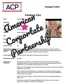 Professional Programs/Memberships/Certifications 1. American Corporate Partnerships ACP Mentorship current, 1 year Veteran Mentor assigned to mentee. Virtual Internship with Division 1 Director of Strength and Conditioning. 2. AASP, 2018 3. USAW United States Olympic Weightlifting Committee Level 2 Certified 2018-2020 #1022732 #40788 4. USAW United States Olympic Weightlifting Committee Level 1 Certified 2017-2019 5. CPR/AED Red Cross Certified- Current 6. SMWW Sports Management Worldwide XOS Certification in Digital Film Analytics Sports Management Worldwide SMWW XOS Digital Film Analytics, intercutting NFL game film and NFL Combine Scouting